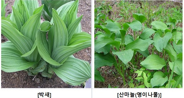 참고로 명이나물은 아래 그림처럼 생겼는데요. 생김새가 ‘박새’라는 풀과 비슷하여 혼동하면 큰일납니다. 박새는 독초거든요. 혹시 산에 가셨다가 명이나물인줄 알고 박새를 섭취하셨다가는 큰일나니 꼭 조심하시기 바랍니다. 명이나물은 그냥 식료품 매장에서 사서 먹는게 좋겠네요.