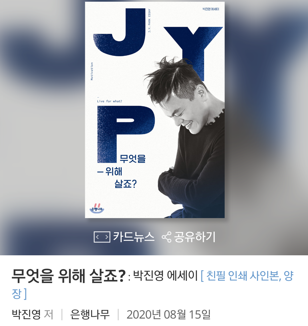 JYP 엔터테인먼트 대표 박진영은 1972년 1월 13일 생이다. 2020년인 지금은 만 48세로 한국 나이로 말하자면 49세이다. 이번 주 MBC <<라디오 스타>> 방송을 봤는데 전혀 48세 같아 보이지 않는다. 오히려 옛날에 <<엘리베이터 안에서>> 그 노래를 부를 때보다 더 젊어지고 얼굴도 더 멋있어진 것 같다. 내가 <<엘리베이터 안에서>> 그 노래의 박진영을 기억하는 이유는 비닐 옷이 충격적이어서.ㅋㅋ 박진영 님은 자기 관리 철저한 것으로 알려졌다. 하루에 챙겨 먹는 영양제와 규칙적인 운동, 유기농 식사. 그래서 안 늙나 보다. 1년 후면 50대인데 30대로 보인다. 그의 삶이 궁금하다. 나보다 성공하고 나보다 건강관리도 잘하고 그만의 노하우가 있을 것 같다. 몇몇 프로그램에서 그 만의 노하우가 소개된 적이 있지만 잘 정리된 무언가 있으면 좋겠다 했는데... 이번에 책을 냈다고 한다. “무엇을 위해 살죠?” 이 책이다. 나는 책을 좋아 하기에 이 책을 구매했다. 초판에 한정해서 친필 사인 복사본도 보내준다니 그냥 사기로 했다. 공휴일이 끼어있어서 8월 18일에 받는다. 내가 기대한 대로 그의 노하우가 한 권으로 정리된 책일까? 빨리 읽어보고 싶다.