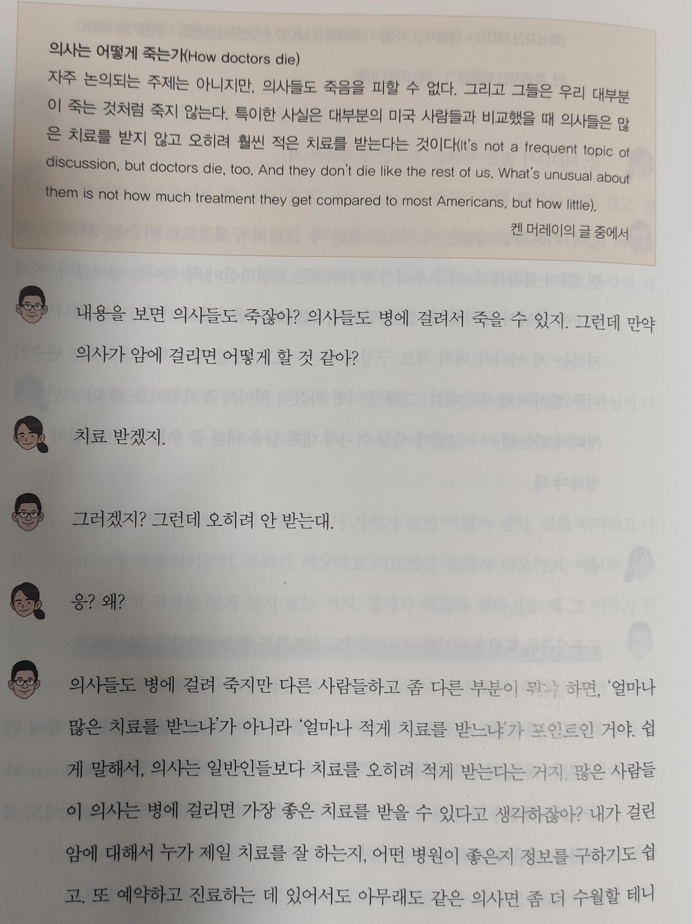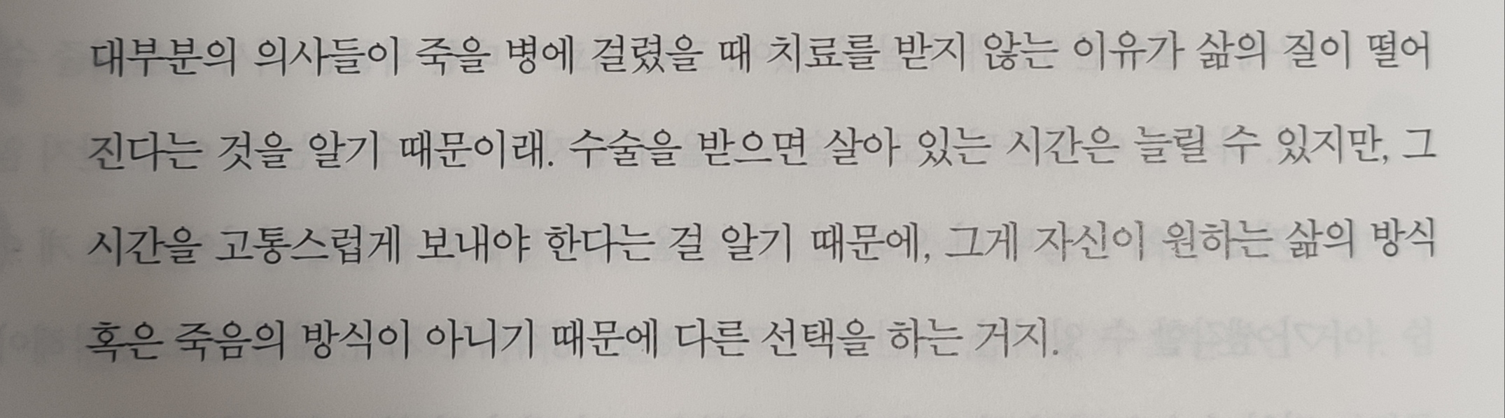 의사는 어떻게 죽는가라는 글을 인용해서 마음고생 없고 편한 투자에 대해 고민해보라는 말을 합니다. 항암 치료를 받는다고 해도 3년 정도 생명 연장은 되어도 치료받느냐 돈 쓰고 옛날처럼 몸을 자유롭게 움직이지 못하고 머리 털 빠진 채로 살아가는 것보다는 그냥 치료를 안 받고 인간답게 살다 죽는다는 것을 선택하는 의사도 많다는 뜻입니다. 본인이 주식 투자를 하든 부동산 투자를 하든 어떤 삶의 질을 위해 투자를 하는 것인지 그것에 대해 고민해 볼 것을 말하고 있네요.