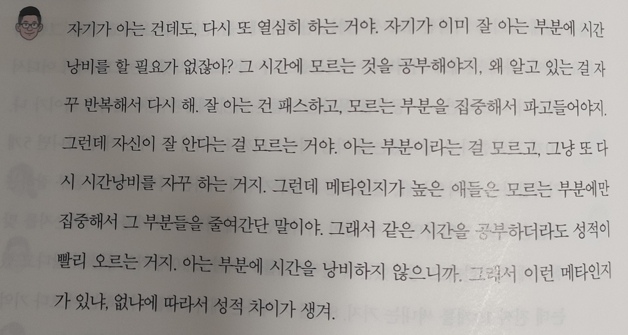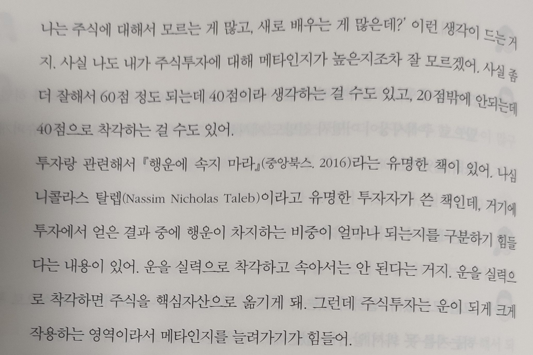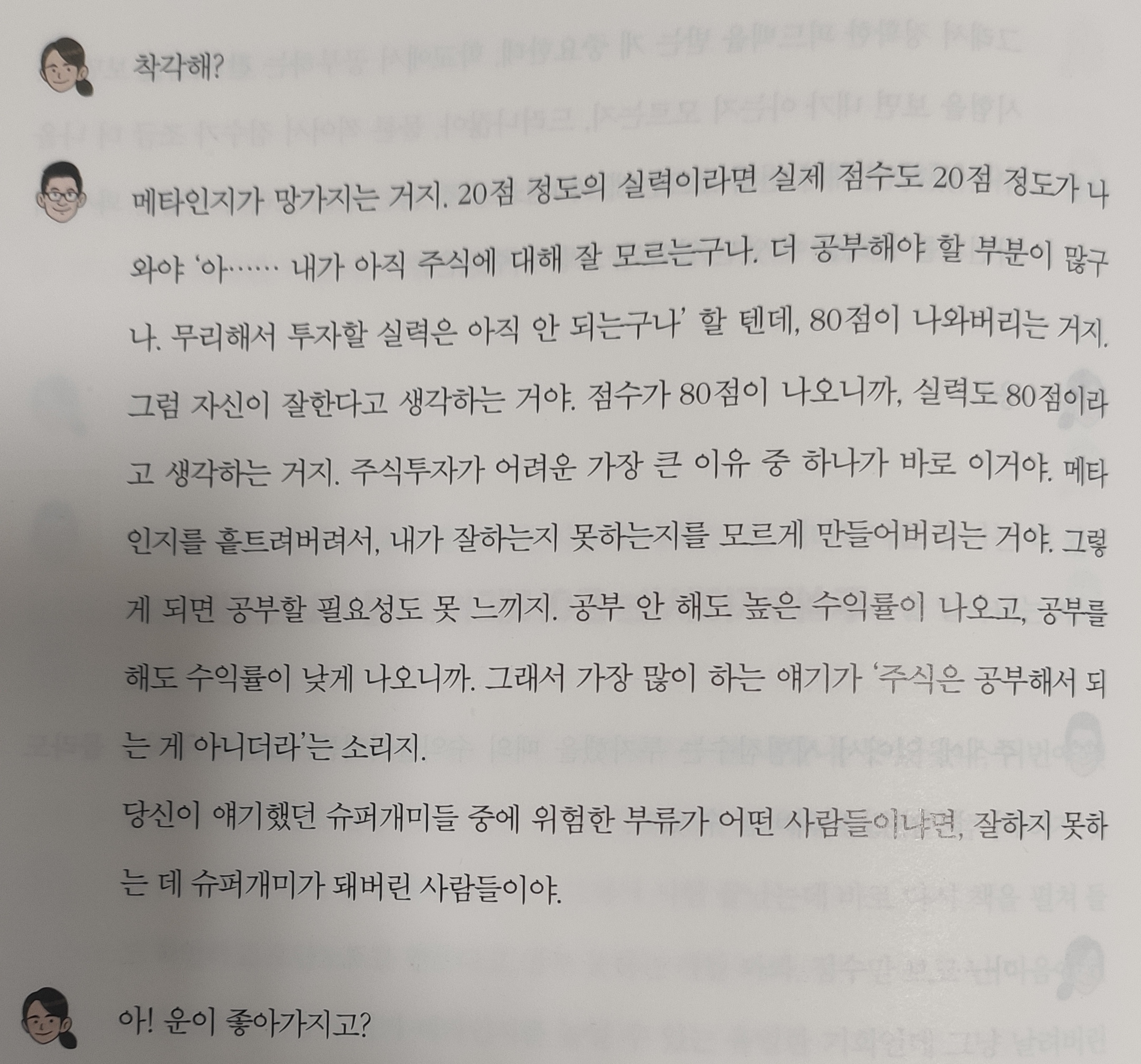 메타인지에 대해서 설명하고 있는데요. 주식 투자는 메타인지를 높일 수 없어서 몰빵 주식부자는 운이 좋은 것이라고 이유를 대고 있습니다.