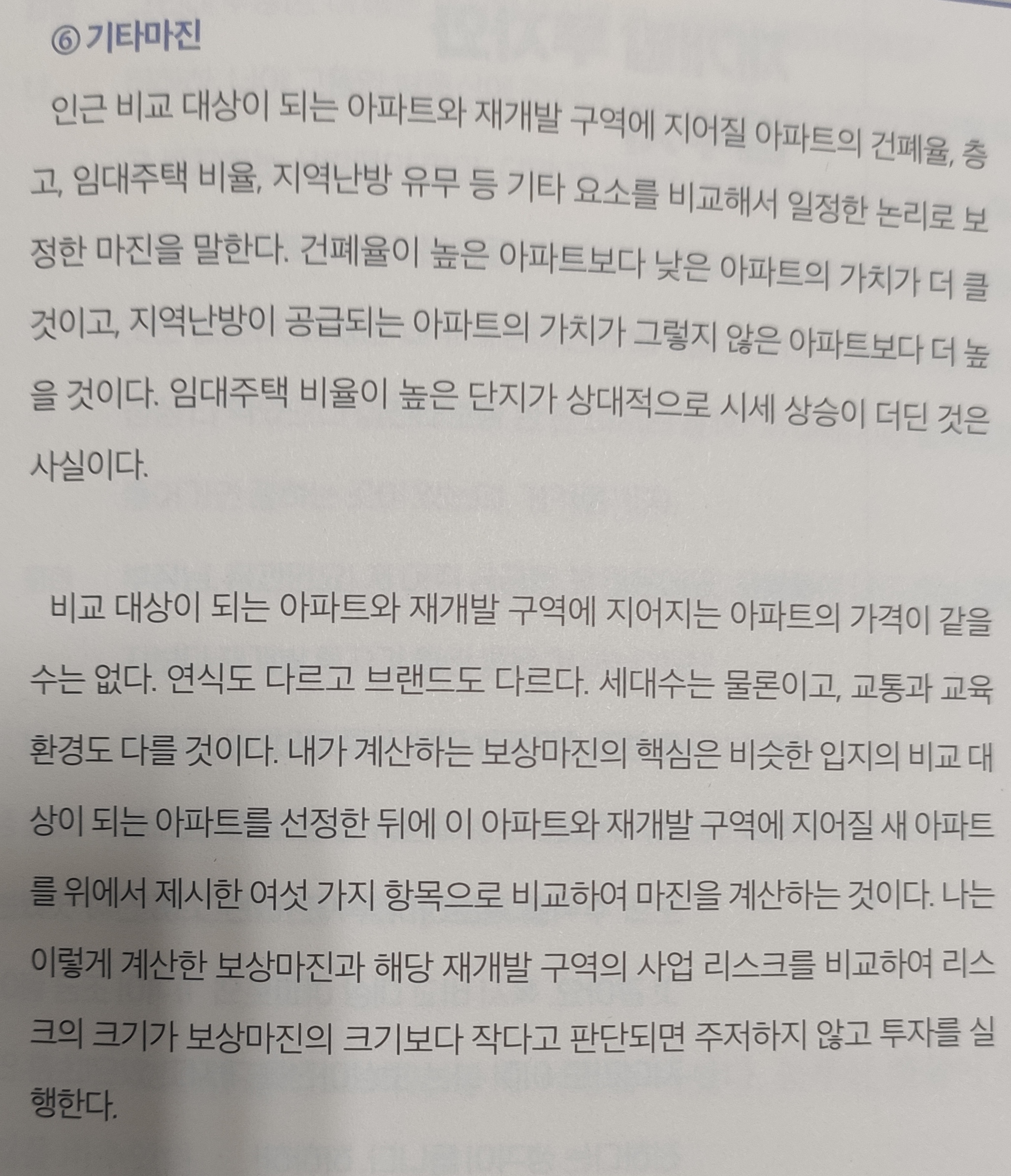 이 책의 장점은 그림을 잘 그려서 이해하기 쉽다는 것과 간략하게 대략적으로 뼈대를 그리는데 유용하다는 생각을 하였습니다. 특히 재개발 투자는 가격의 변동성에서 버텨내야 하는데 워낙 투자금이 많이 드는 자산 항목이라서 버티기 힘듭니다. 그래서 “보상마진”을 6가지로 분석하고 투자 실행하라고 되어 있는데 이 “보상마진”이라는 항목이 다른 책에서 볼 수 없는 특이점입니다.