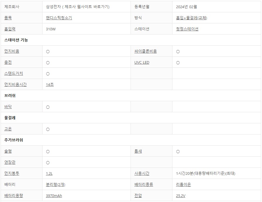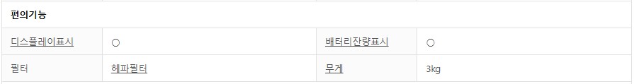 흡입력이 우선 중요해보일 듯... 이 제품의 흡입력은 무려 310W나 된다. 다음으로 배터리 용량은 3970 이다.